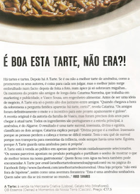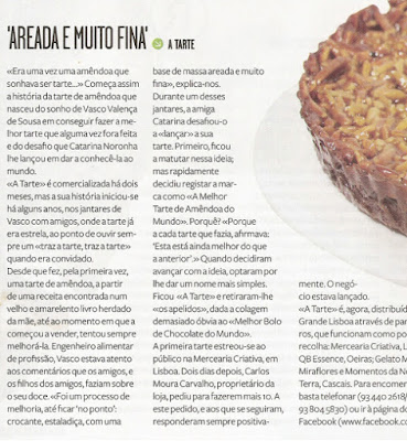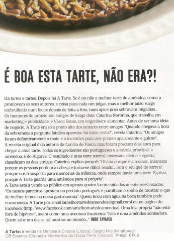 "A amêndoa cumpriu o sonho e tornou-se tarte: “Era uma vez uma amêndoa que sonhava ser tarte”. É assim que começa a história desta tarte de amêndoa, que a Mercearia Criativa, em Lisboa, está a lançar “oficialmente”. Há já algumas semanasque a tarte de amêndoa está à venda na mercearia da Avenida Guerra Junqueiro, mas o Carlos e a Susana, os proprietários da loja, gostam tanto dela que decidiram fazer lançamento oficial.